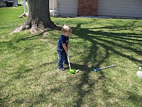 Logan's cake was Garfield, grandma Shar made Logan's cake, I'm not a baker. Shar did an awesome job! Thanks! so much. Its amazing how much Logan has learned, last year we needed to help him eat cake, this year he knows what to do grab it and take the biggest bite possible. Such a big boy. After cake we opened the many gifts. Logan is very particular about making sure the all the paper is completely off. His gifts we great this year, his gifts included; Hot wheels trike, T-ball set, frog overalls, frog towel, wooden bat, plastic baseballs, baseball outfit, Mickey Mouse table & chairs, golf clubs, balls & bag. So glad that the weather was perfect so we could go outside and play with Logan's new toys.